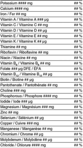 Serving sizes must follow Health Canada’s regulated Reference Amounts. They generally reflect the food as sold, unless the food is typically consumed only after preparation, such as coffee, tea, or dry mixes.