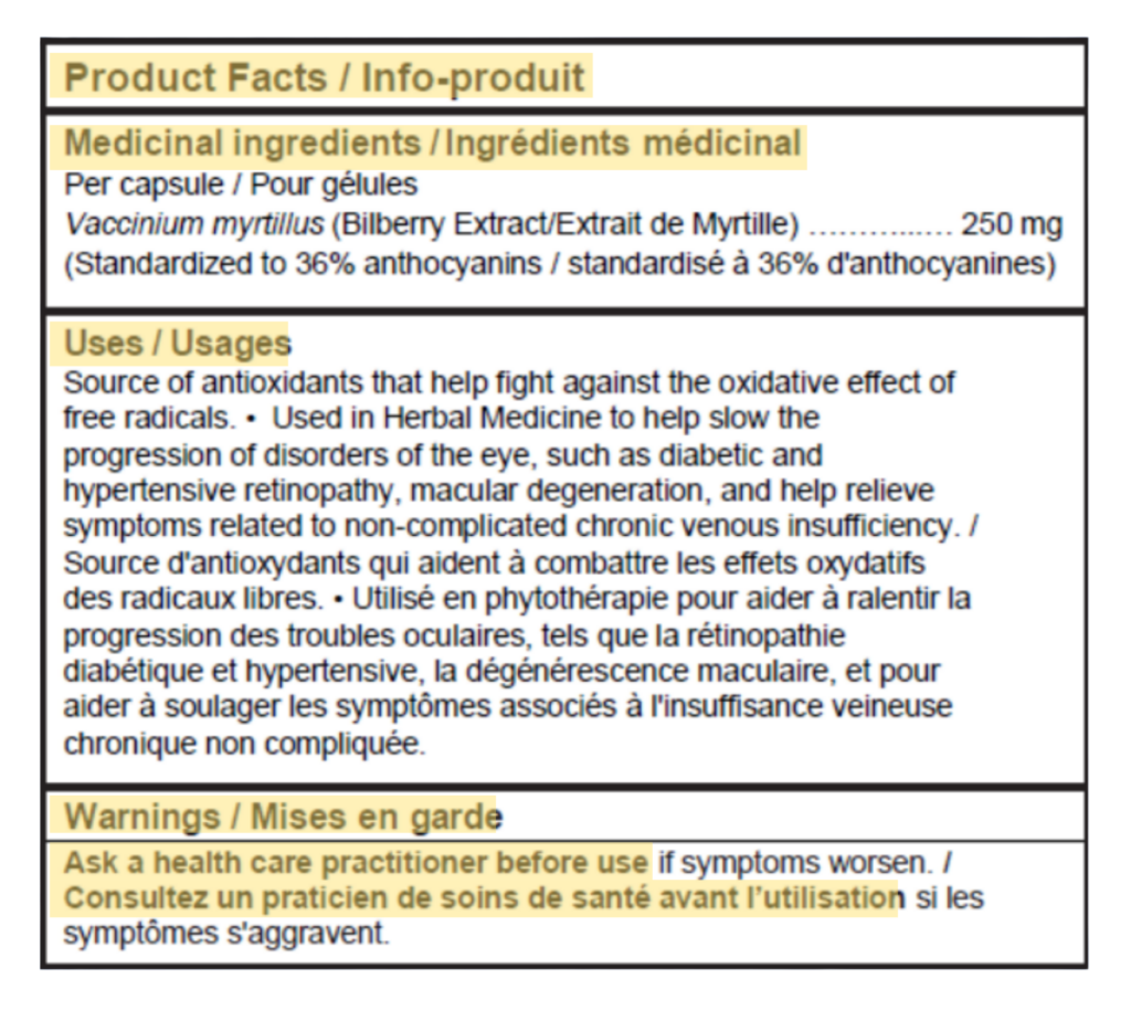 Labels must include a bilingual Product Facts Table that clearly outlines the product’s medicinal and non-medicinal ingredients, recommended use, dosage instructions, warnings, storage conditions, and contact details. The label must use a sans-serif font in a minimum size, with high-contrast black text on a white or nearly white background. Headings must be bolded, and sections must be clearly separated to help consumers find information quickly. For more information on labelling specifications and formatting requirements, please visit Health Canada’s NHP labelling regulations.